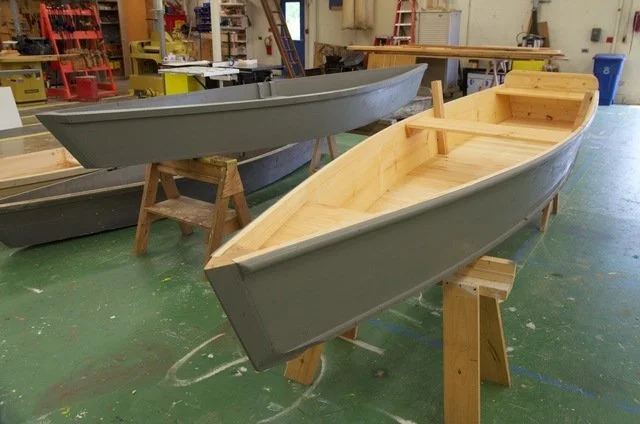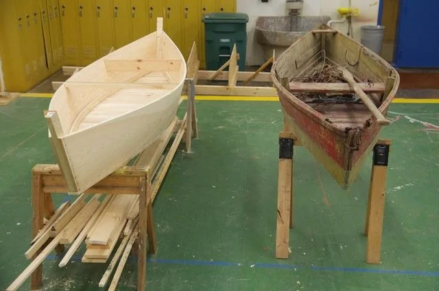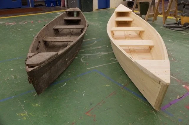 Two student-built replica boats. The posts in the boat on the right held oarlocks, an unusual feature we've found on several historic boats.