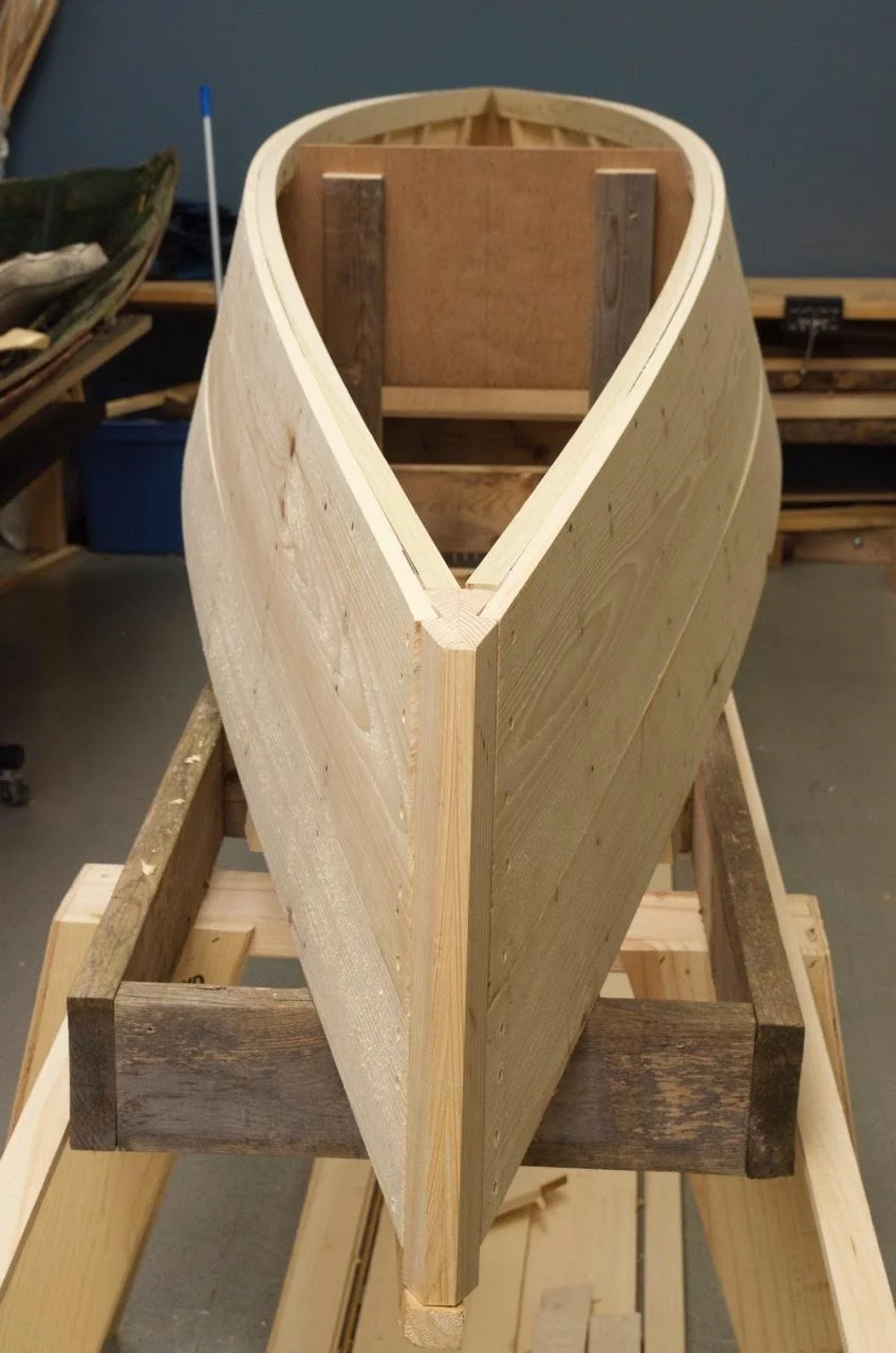 All that was left of the original boat were two side planks, largely intact, and the rotten remnants of some bottom planking and thwarts. The boat was obviously a very simple form: just two planks bent around a center mold and fastened at the end, the shape held by the thwarts. We would have been lost as far as accurately reconstructing the boat but amazingly, the Auer’s still had the original center mold their mother used building boats.